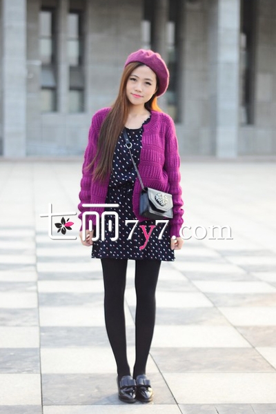 紫色短款针织衫外套,内搭藏蓝色波点连衣裙,两种色彩的相撞毫无违和感,轻松衬托出MM白皙的肌肤。衣裙上面的波点特别好看,抽绳收腰设计,很好的修饰腰身,穿上黑丝和蝴蝶结皮衣,背上黑色单肩斜挎包,学院感超强。