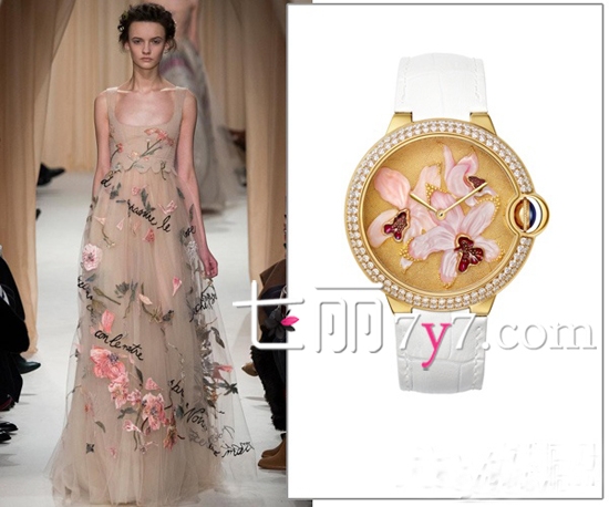 卡地亚Ballon Bleu de Cartier金属珠粒工艺和雕刻珍珠母贝兰花装饰腕表