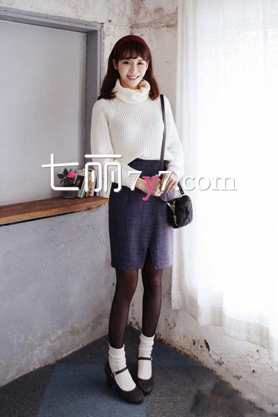 经典不败的高领毛衣,白色最为百搭时髦,散发出一种独有的春美感。搭配藏蓝色格纹高腰半身裙,很是清新好看,再配上白色短袜和扣带高跟鞋,透着职场女性干练优雅气质。黑色绒面小巧单肩挎包,让造型多了一份复古范。