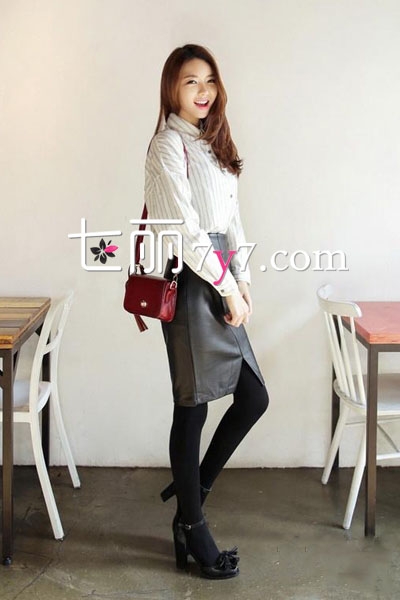 清新素雅的白色条纹衬衫,宽松的版型配上落肩谁,百搭又好看,搭配黑色皮质中长裙,小开叉设计,性感迷人凸显优雅感,穿上黑色丝袜和踝带高跟鞋,用酒红色单肩挎包凹造型,搞定职场时尚造型。