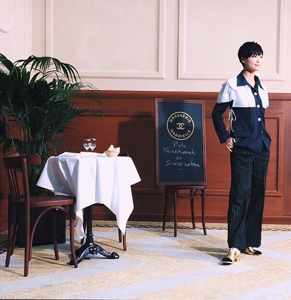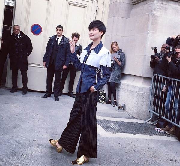 2015年香奈儿Chanel秋冬发布时装秀场上,李宇春以一身干练的条纹西装外套及长裤亮相,整体看上去十分精神帅气。大长腿踩着一双黑金色的平底鞋,身上都佩戴着Chanel 的配饰。