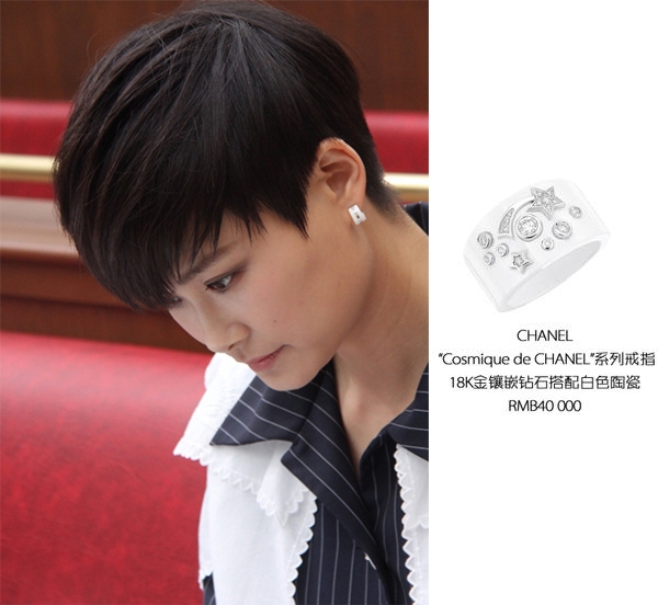 2015年秋冬巴黎时装周的秀场上,Chanel香奈儿发布了自己的最新产品,上面三张图中,帅气李宇春耳朵上佩戴的、脚上穿的鞋子还有手上白色腕表,都是香奈儿,她的帅气让很多粉丝尖叫着。