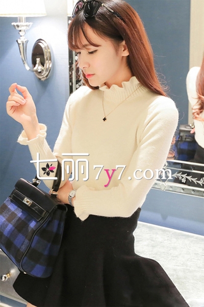 米白色毛衣,给人一种纯美的感觉。领口和袖口的荷叶边设计,非常精美好看,散发着温婉气质,尽显温婉淑女范儿。这么一款简约甜美的毛衣,不需要太过繁复的配饰装点,简简单单的配上细细精致短款项链就很美了。