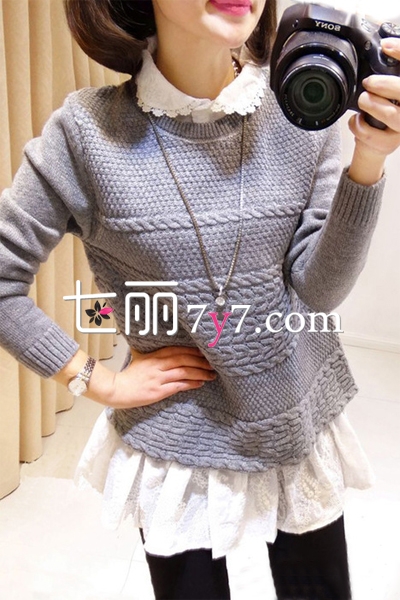 灰色毛衣厚实温暖,简约版型和花样编织纹理,有着更加讨人喜欢的时尚效果。露出的衬衣领增添时髦感,不需要过多的装饰,配上一条细长的银饰项链,吊坠为球形水钻,简约精致。增添了几分华丽感。