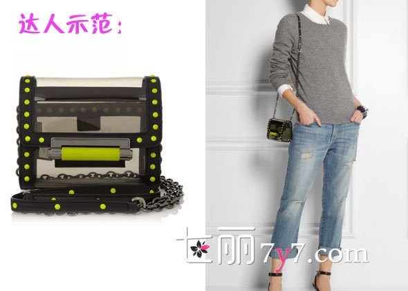 这款迷你小包在今年夏季非常流行,轻巧又方便,PVC的材质非常可爱又新潮,荧光色的铆钉和黑色人造皮革边饰,可以装下你的手机和卡片哦。