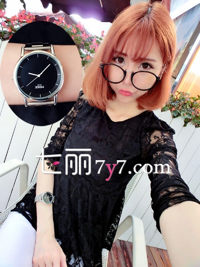 搭配示范:黑色蕾丝衣服+银色链条手表