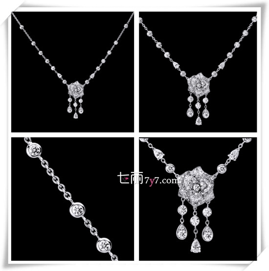 Piaget Rose白金项链,镶饰3颗梨形美钻,约为0.75克拉,111颗圆形美钻,约为3.18克拉。白金的色泽光亮而冷艳奢华,搭配V字领或露肩的晚礼服,增添独特的韵味,提升高贵的气质。
