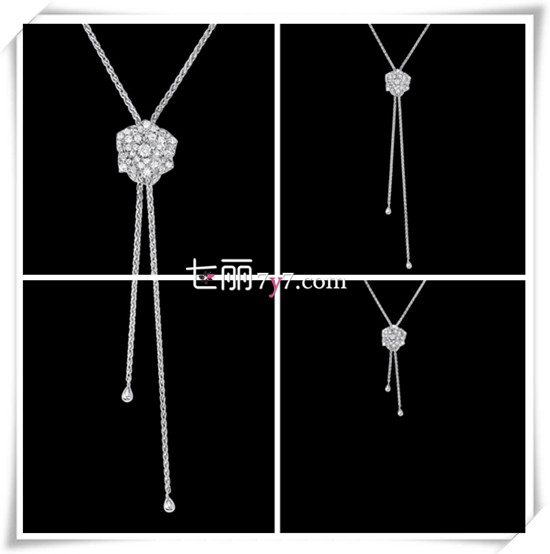 Piaget Rose白金钻石项链,镶饰41颗圆形美钻,约0.72克拉。耀眼的钻石堆砌出颈间的美丽光。随意挑动长挂链的位置,不管是高领还是低领的礼服都非常适合,细腻动人。