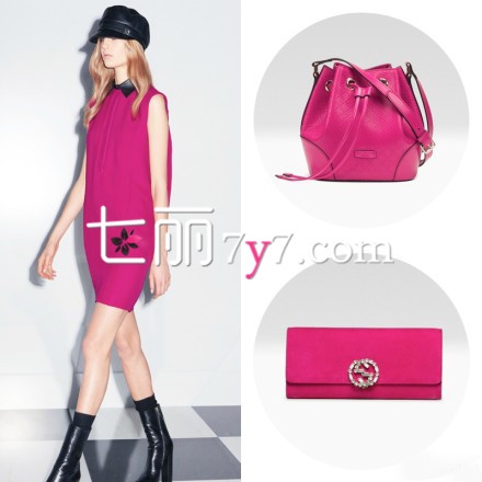 Gucci玫红系水桶挎包+钱包