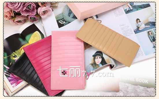 时尚点评:四色可选的小巧型钱包,外壳上的折痕,放置各类银行卡、信用卡,外放式的设计方法给人眼前一亮的感觉。