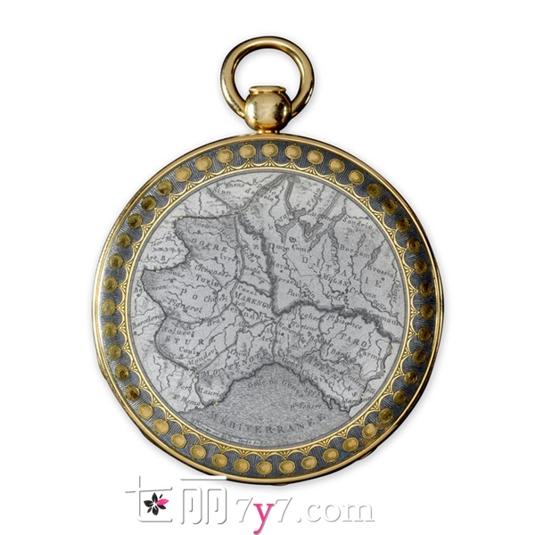 金质猎用表壳,镀银底盖饰以手工镌刻的九个意大利行政区域地图,银质手工镌刻面盘,3个偏心面盘显示为秒、星期及日期,温度计,红宝石柱轮擒纵机构,直径50毫米。于1811年6月28日以4,800 法郎售予卡米尔·贝佳斯王子。
