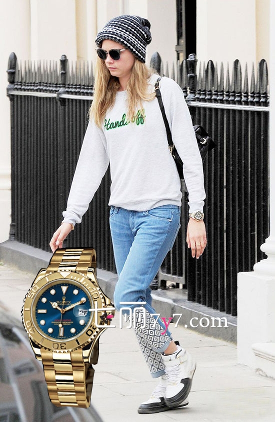 时尚点评:卡拉·迪瓦伊全身武装式的出街,街头范儿十足,帅气养眼,而手腕上的金色腕表也颇为引人注目,劳力士游艇名仕型系列16628蓝盘腕表,18K黄金,蓝宝石水晶玻璃,虽是新一代名模,但身价不菲哦!