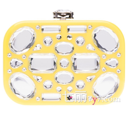 MiuMiu有机玻璃手拿包,外形如玩具积木,颜色多姿多彩,外层纯手工有序地贴上各种大小的有机玻璃,这些玻璃被切割成大小各异的宝石形态,一颗颗透亮无比;顶部弹簧开关配以施华洛世奇宝石,整体奢华高贵不失趣味性!