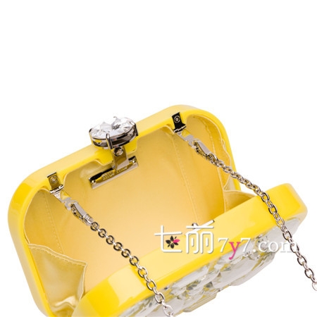 这款手拿包外形如玩具积木,可爱趣味性十足;颜色同样多姿多彩,超吸睛。外层纯手工有序地贴上各种大小的有机玻璃,这些玻璃被切割成大小各异的宝石形态,一颗颗透亮无比;顶部弹簧开关配以施华洛世奇宝石,非常的高贵奢华!