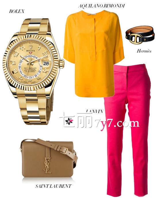 金色的奢华腕表总能提升质感,也最能彰显一个人的身份地位,搭配休闲款的T恤衫和高腰紧身裤,随性而简单,用腕表凹造型,优雅而华丽。