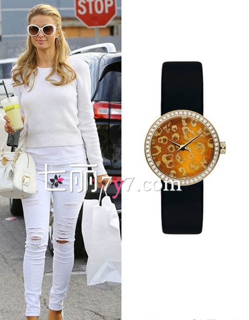 Paris Hilton佩戴的这款腕表,黑色的表带搭配金色的镶钻的表盘,彰显出精致而奢华的质感,表盘内豹纹的设计更具野性,而表盘外一圈镶钻的设计,则凸显出极致的奢华感,搭配纯白的上衣与破洞牛仔裤尽显时尚个性。