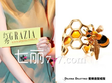 手指上所带的戒指是Delfina Delettrez蜜蜂造型戒指。没有错!“蜜蜂”们,杨幂戒指就是一只蜜蜂哦!仿佛告诉喜欢她的蜜蜂们,你们的杨幂正式回归影视队伍了。