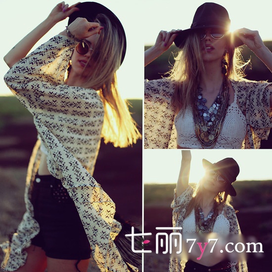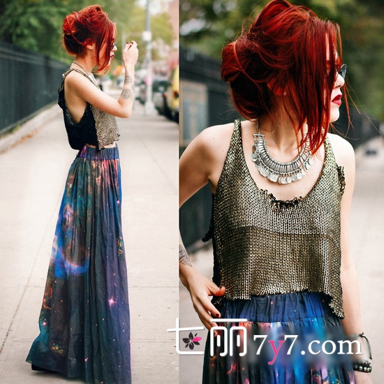上半身复古铜色的背心,与下身的星空长裙搭配,给人一种双目眩晕的感觉。背心的领口下掉的厉害,虽然这样会很性感,但是却很突兀,这个时候就需要一条民族风项链来点缀整体。