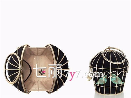 Hello Shanghai Pollie包包,外观酷似鸟笼,趣味横生。其面料彩用很有质感的绒料,绒料一侧刺绣两只灵动的小鸟,再以镀金金属条包裹做外衣,非常的坚实,整体精致又个性十足!