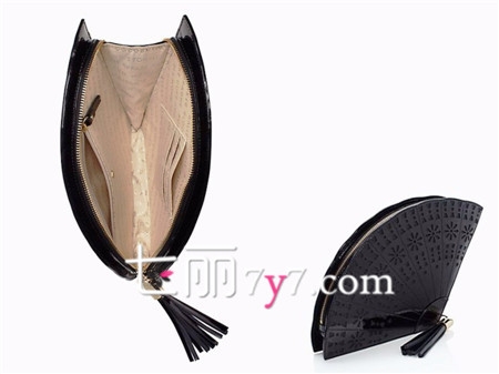 Hello Shanghai Milan包包,外形如扇,非常的优雅。黑色平纹皮革加上浅金色流苏拉链开合,百搭时尚而不失个性。