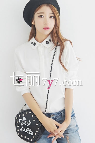 时尚点评:黑色小花朵纯色打底白衬衫,是白搭单品,是很多姑娘的选择,搭配牛仔裤,简约且时尚。带着邻家小女孩的感觉,青春俏皮。包包选择的话,当然要韩版的圆形挎包啦!让整体造型变得养眼。