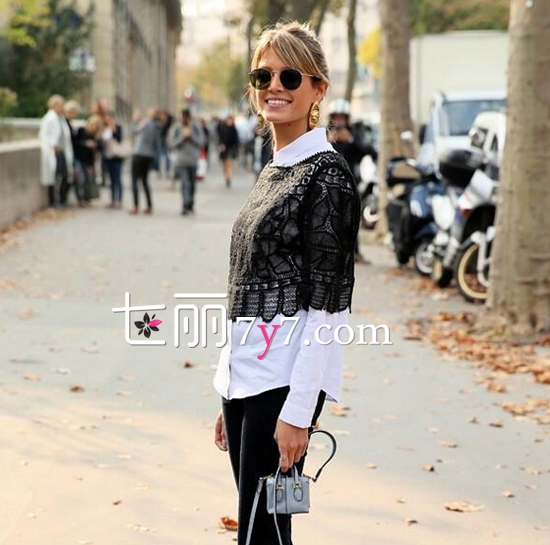 黑白造型视觉效果简约同时自带时尚感,这样的搭配服饰显得复古,喇叭阔腿裤迎来的特别感,加上蕾丝的层次,与箱型手提包巧妙的搭配,给人庄重的感觉,魅力的着实让人过目不忘。