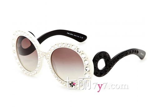 Prada这款太阳镜,白色镜框给人清新之感,镜框上镶有闪耀的水晶,使正面看上去更加奢华,棕灰渐变色镜面能很好地为你挡去强烈的太阳光,黑色镜腿与白色镜框形成鲜明对比,非常别致!