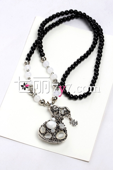 时尚点评:如果你是金牛座或者是财迷,那么这款项链非常适合你,钱袋的装饰,装点上大小不一的猫眼石,透亮的感觉让钱袋“熠熠生辉”,项链上方用黑色与白色的珠子串好,显的更有档次。