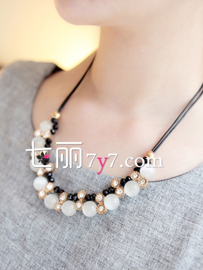 时尚点评:简单的就是美丽的,白色的猫眼石和黑色的珠子衬托出脖子的纤细,水钻带一点亮闪闪的感觉,不得不说猫眼石加水钻的配搭非常漂亮,夸张但又不缺清新感,干净利索。