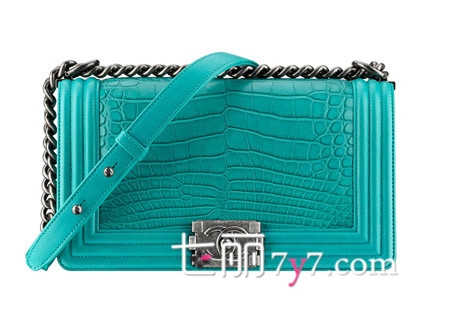 著名的香奈儿男孩包(Chanel Boy Bag),不是采用一贯的车线面料,而是充满异域风情的鳄鱼纹皮料制作而成,看起来更为别致吸睛。湖蓝配色清新优雅,相信是很多女生的心头爱。