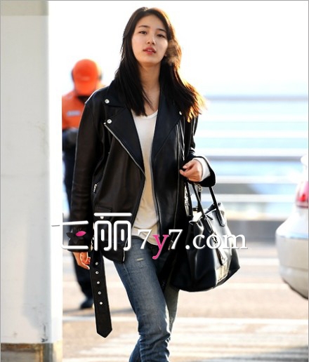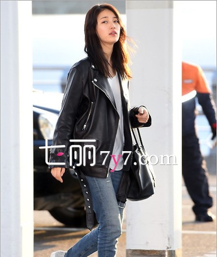 可爱的miss A成员裴秀智,现身机场,黑色的皮夹克帅气又休闲,内搭白色的毛衣和蓝色的牛仔裤,以及黑色的包包,整体感觉简约又时尚。