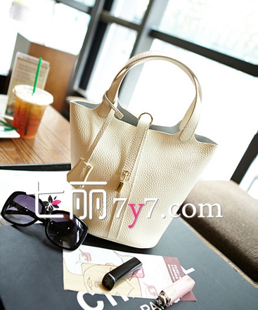 时尚点评:白色极简模式,水桶模样的设计,有足够的空间装更多的东西。又称为菜篮子,简单随意,包包上的绑带和拉环的设计,低调奢华有内涵,搭配衣服特别的有范。