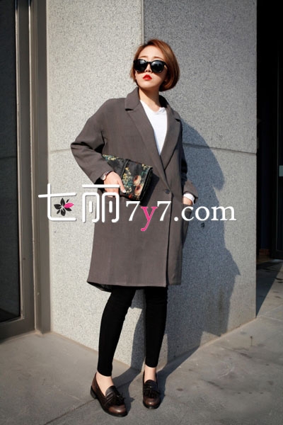 深灰色茧型大衣,落肩款设计非常有特点,让原本单调的款式变得颇具亮点,一粒扣帅气利落,内搭白衬衫,下穿黑色紧身裤和皮鞋,时髦感十足。印花手拿包的加入,让造型变得更有生气,分外有型格。