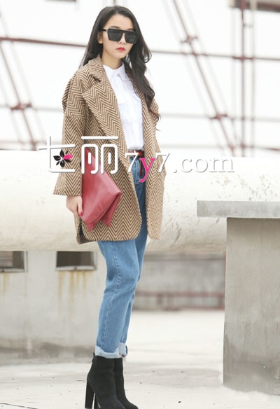 波浪形格纹呢子大衣,廓型设计与大翻领款式,彰显经典时尚感,给人一种别样的干练优雅,内搭白色衬衫,下穿宽松高腰小脚牛仔裤和高跟短靴,帅帅的很有范儿。红色手拿包包与黑色墨镜的点缀,营造强大气场。