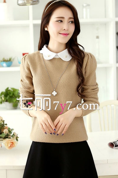 卡其色毛衣,颜色复古百搭,清新的娃娃领设计,非常优雅迷人,搭配上一条简单的毛衣链后,毛衣项链配色,两者互相呼应,突出银色的部分,就显得这款毛衣搭配的层次性丰富了许多,很好看的哦。