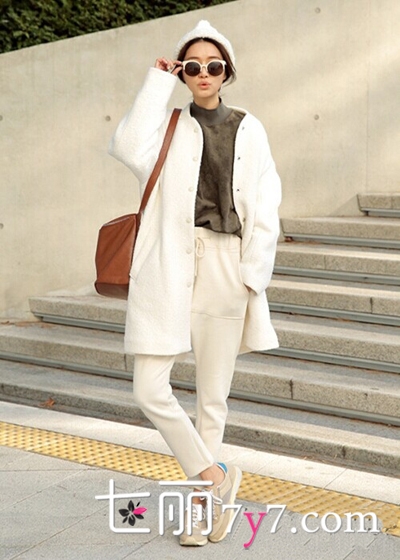 白色的长款大衣+白色的休闲裤装,简单又大方,内搭一件灰色的打底衫,十分低调,这一整身白色系的搭配看起来是不是有些单调了,那么很简单,此时就需要用一个深颜色的来做中和更好,而这款斜挎包就是最适合的,让你魅力尽情绽放!