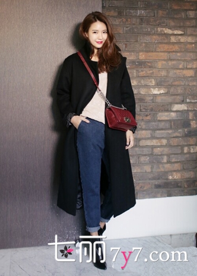 低调而又经典十足的黑色大衣,超长的设计能极好的凸显出女性的魅力,同时还有一些小神秘气息,搭配白色的毛衣和牛仔裤,简单又时尚,为了增加整体的吸睛度,再搭配一个酒红色的斜跨链条包,大大提升了女性的魅力和吸睛度。