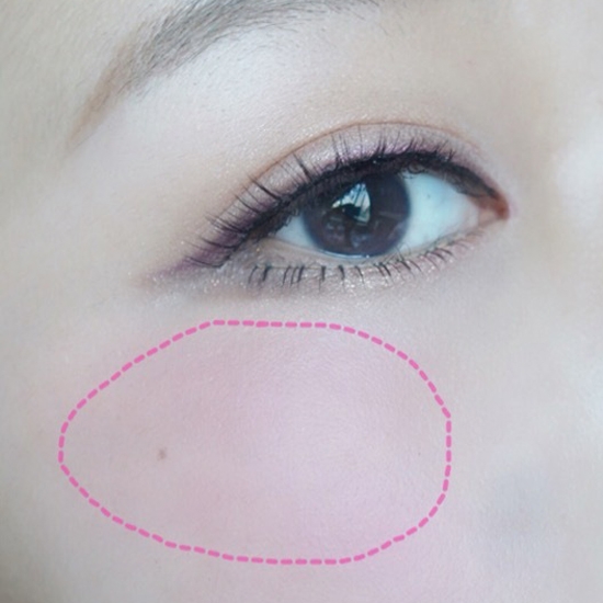 第十四步:打上高位粉色腮红,腮红范围在眼部下方,具体部位如图所示,这样比较显年轻哦~