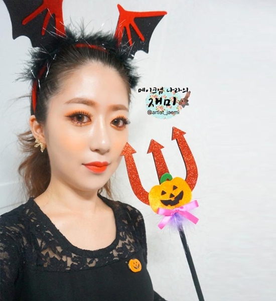 橘色的眼妆配上蝙蝠发卡和小魔法棒是不是也很有味道呢?一款小清新的森林系精灵妆容哦。浅棕色的眉毛,搭配橘色的眼影和橘色的唇妆,没有浮夸的画法,这里都是很正常的画法,只是橘色系的的精致妆容和森林小精灵更配哦!