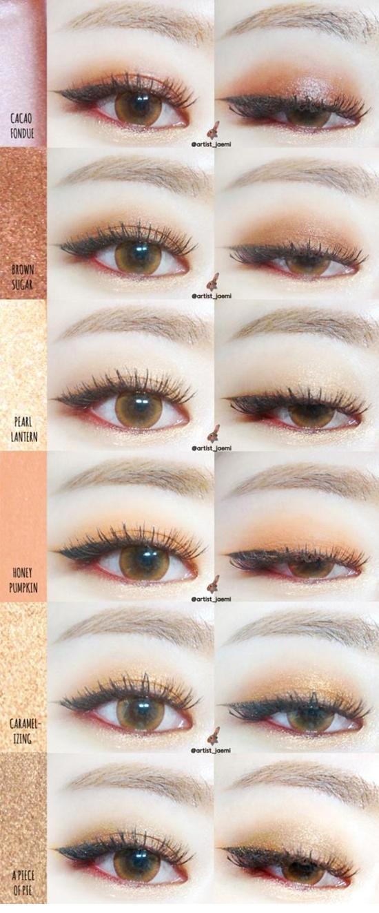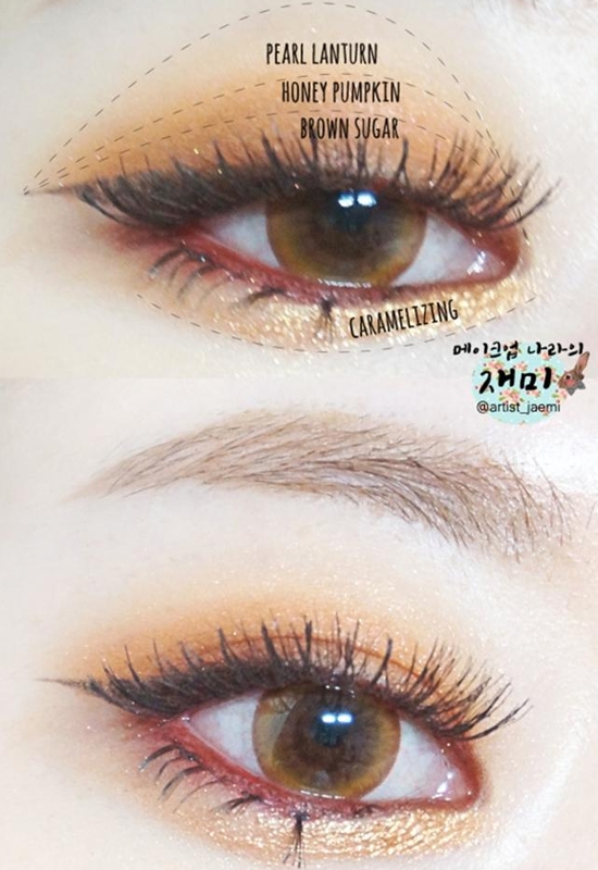 这款眼妆就是先用PEARL LANTURN打底,再叠加晕染HONEY PUMPKIN和BROWN SUGER色,最后用CARAMELIZING在下眼睑提亮。