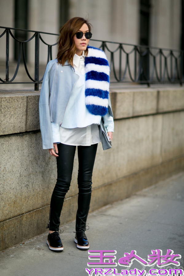 春冬单品组合搭配:短款夹克+白衬衫+皮裤+皮草