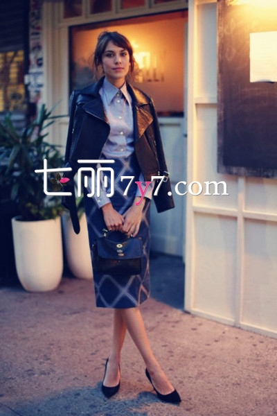 搭配看点:款式非常经典的机车皮衣,内搭精致利落的车衣,扣子全部系上更显干练和沉稳,当然也可以适当松开一到两颗扣子更添性感与随性。下搭别致格纹长裙,高腰的设计极大的增加腿部比例。再搭配一双极具女人美丽的黑色浅口高跟鞋,色彩上与皮衣呼应,视觉上延长腿部线条,让双腿展露得更加迷人。复古的手提包让造型更有时尚韵味。