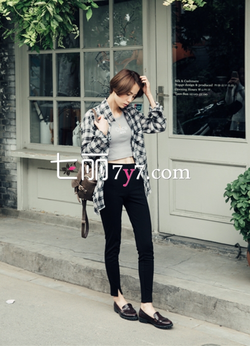 LOOK 1:黑白格纹衬衣+灰色T恤+小脚裤