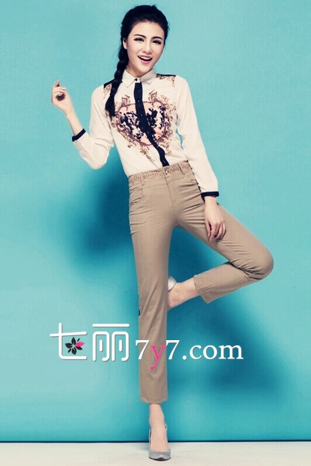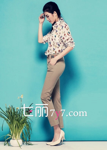 搭配看点:印花非常具有柔美女性气质,搭配优雅的卡其色裤子更显清新气质,同时也让整体造型更有生气和灵动的美感。不管是烂漫的碎花还是略带童趣意味的卡通印花,亦或是小面积的印花图案都十分个性和抢眼,绝对能够穿出不一样的美艳气质。
