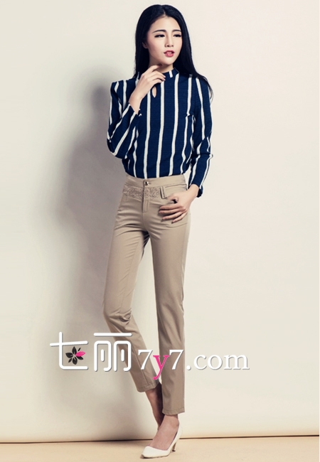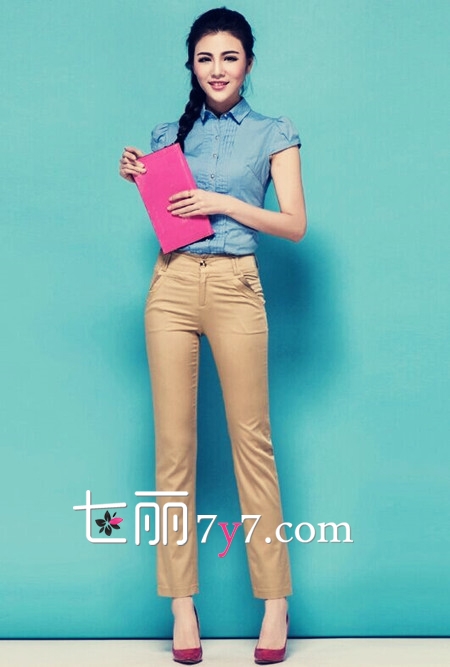 搭配看点:卡其色裤子搭配蓝色上衣很有职场丽人之感,建议搭配质感更加飘逸、垂坠感更加的蓝色雪纺衫,搭配一款简约大方的项链配饰,提升造型的华丽感。搭配玫红色高跟鞋更显柔美,也可以搭配黑色或白色高跟鞋,更加耐看。