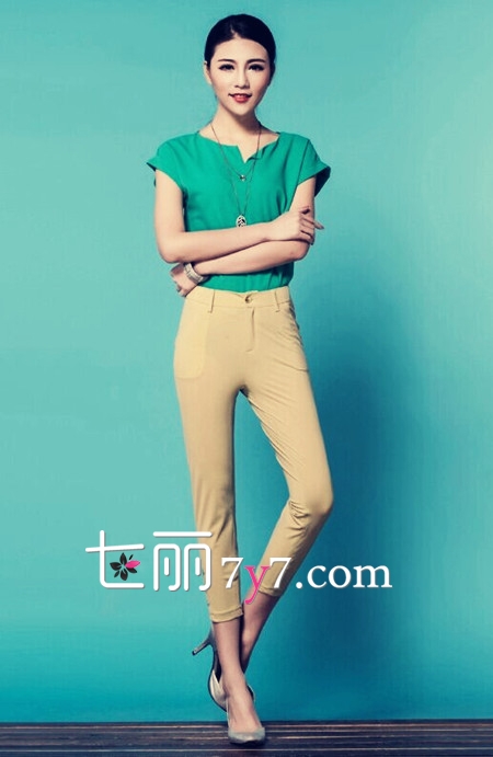搭配六:卡其色裤子+绿色上衣