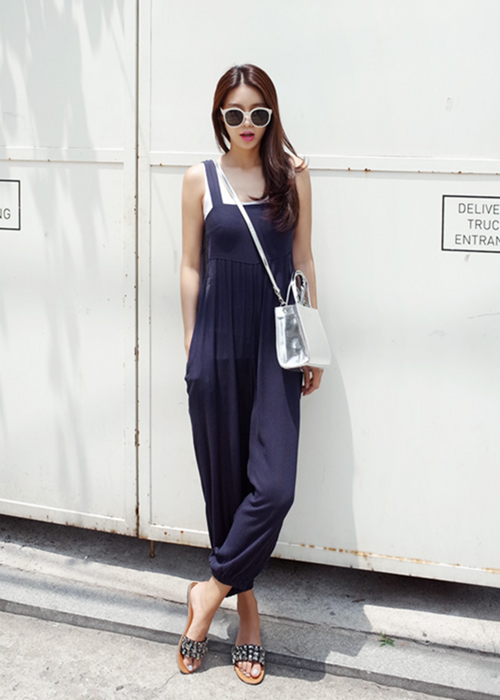 搭配看点:白色背心搭配背带裤更加舒适性感,当然,也更解暑,鞋子选择平底凉拖、系带凉鞋或帆布鞋都十分适合,配上一款吸睛的迷你斜挎包更显精致优雅。