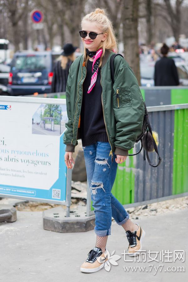 小编点评:在秋冬出街,给短款棉衣搭配一件毛衣会更加温暖。除了图中的纯色圆领毛衣以外,也可以考虑搭配印花,或者高领毛衣,来增加时尚度。棉衣搭配破洞牛仔裤的造型适合个性且酷爱街头风的女生,背上一个时髦双肩包,冬季照样可以玩转潮流。