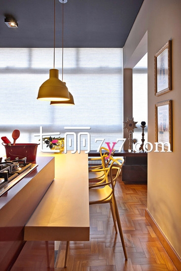 同样是简单的T型餐桌,镶入到吧台从而使餐桌固定的更加稳定,也有效的扩宽了吧台的操作面积,节省空间的同时非常的养眼,比较适合单身人士,或三口之家的房子。