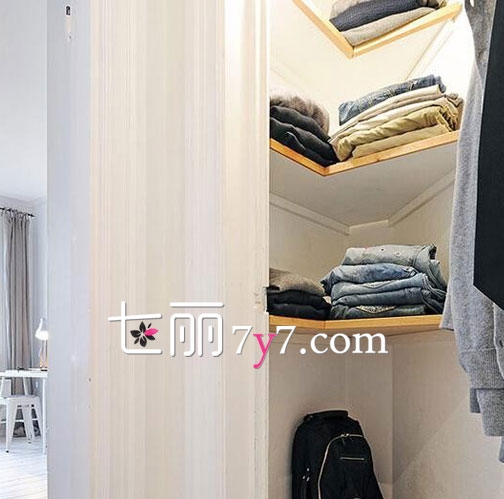 很多人因为觉得麻烦不想走太多路,于是就是转角处或者一些缺角的地方,设计出一个衣帽间,该用搁架用搁架,要是能找到特殊造型的收纳筐壁,刚好匹配角落造型,那就真是太完美了。当然前提还是你不信家居风水之说,那么就没什么太多可想的。